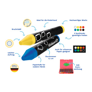8 wax crayons in bright colors; Round Wax Crayons; Waterproof; Break-resistant; Easy application of paint; Ideal for learning to paint and write; In a sturdy plastic case; Including scraper; Colors: White, Yellow, Orange, Red, Blue, Green, Brown, Black, Made in Germany